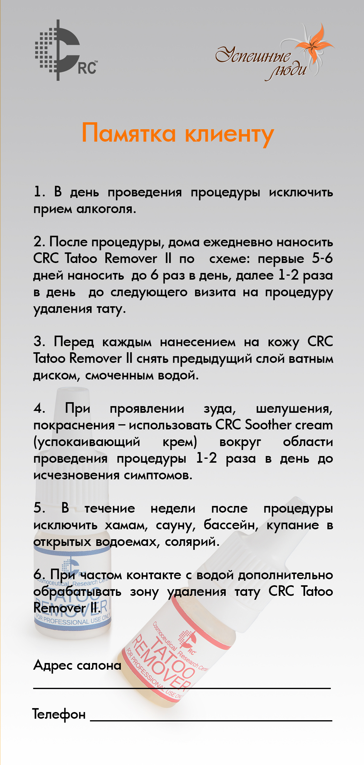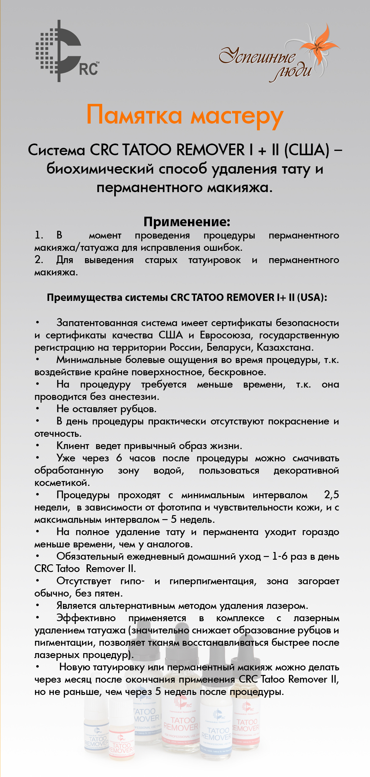 We invite you to become a distributor / trainer for training and sales of CRC Tatoo Remover I + II Biochemical System